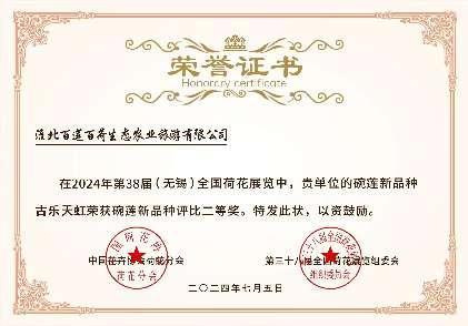 11 07月2024 了解詳情 百蓮百荷參加全國荷展獲全國荷花睡蓮新品種評比二等獎! 第38屆全國荷花展覽于2024年7月4日在江蘇無錫市舉行,來自全國各地的荷花愛好者、園藝師以及企業代表齊聚一堂,共同見證了這場荷花界的盛世。我公司精心培育的荷花新品種“古樂天虹”與睡蓮新品種“拇指嬌娘”在本次競賽中脫穎而出,榮獲了寶貴的二等獎。